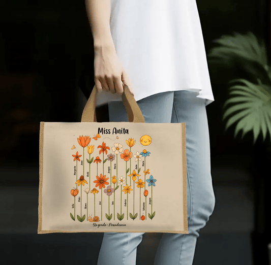 🛍️🌸 Bolso de algodón y arpillera / Tote Bag personalizada con nombre de maestro y alumnos - Flores