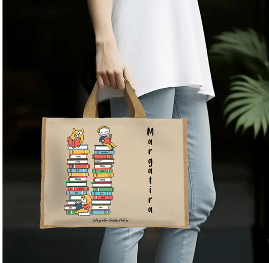 🛍️📚 Bolso de algodón y arpillera / Tote Bag personalizada con nombre de maestro y alumnos - Libros